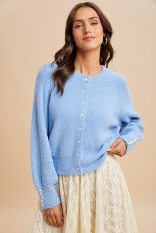 Fuzzy Ribbed Knitted Cardigan- Icy Blue