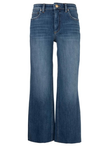 • Dramatically wide legs with raw hems lend retro detail to these flared jeans that showcase light whiskering and sandblasting beneath the stylish high-rise waist.
