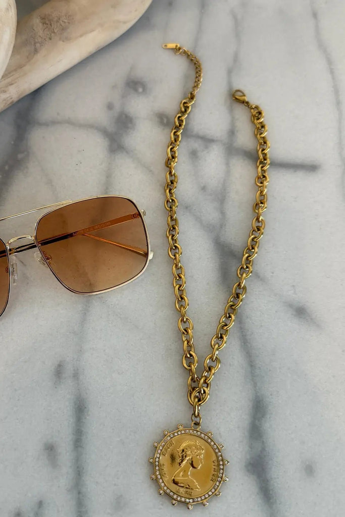 Add a splash of shine to your look with this playful chunky gold coin necklace. Designed to fall between 13 and 18 inches, it perfectly frames your neckline while adding bold style. Plus, its water-resistant finish means you can wear it worry-free, rain or shine.