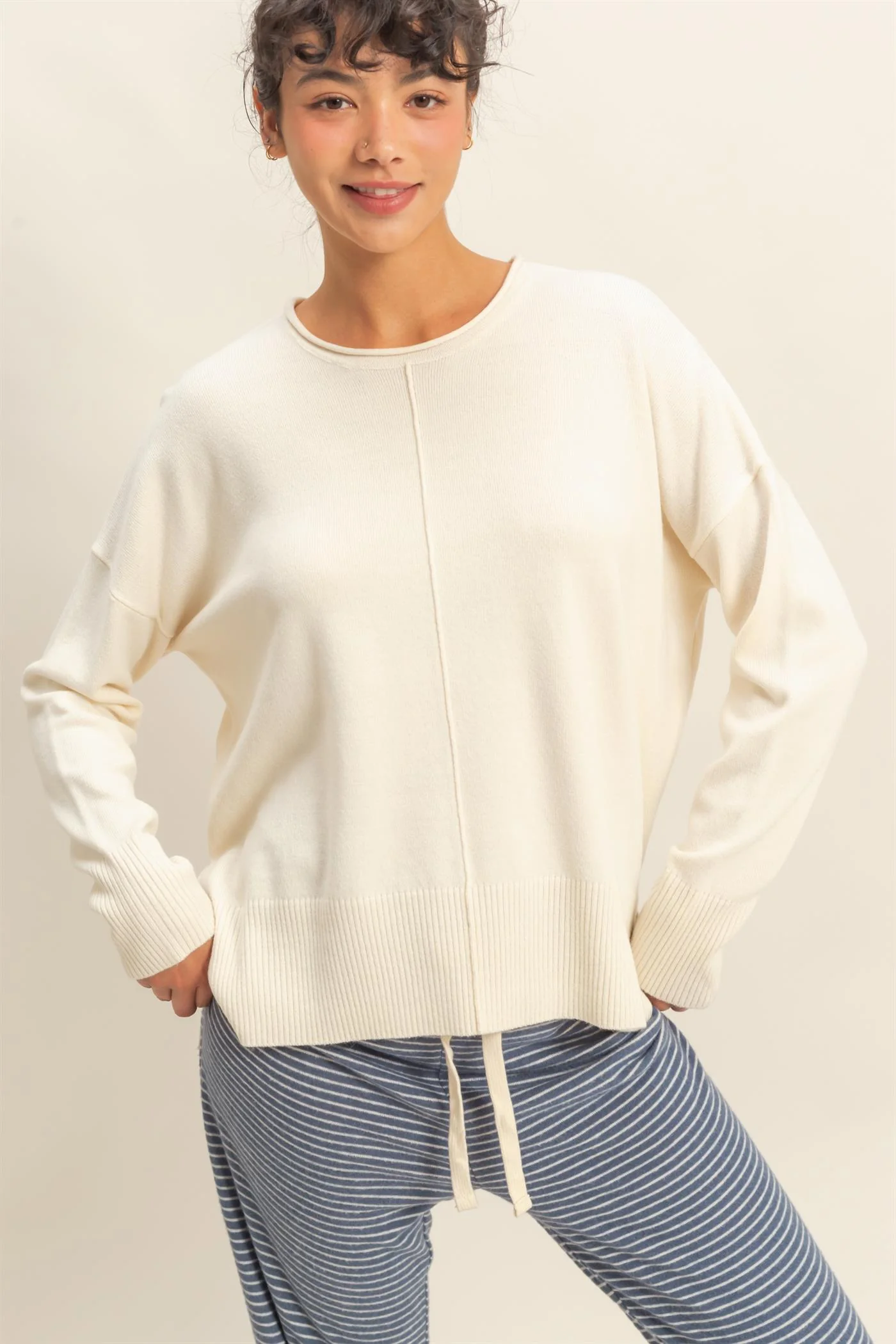 Roll Neck Drop Shoulder Sweater-Cream