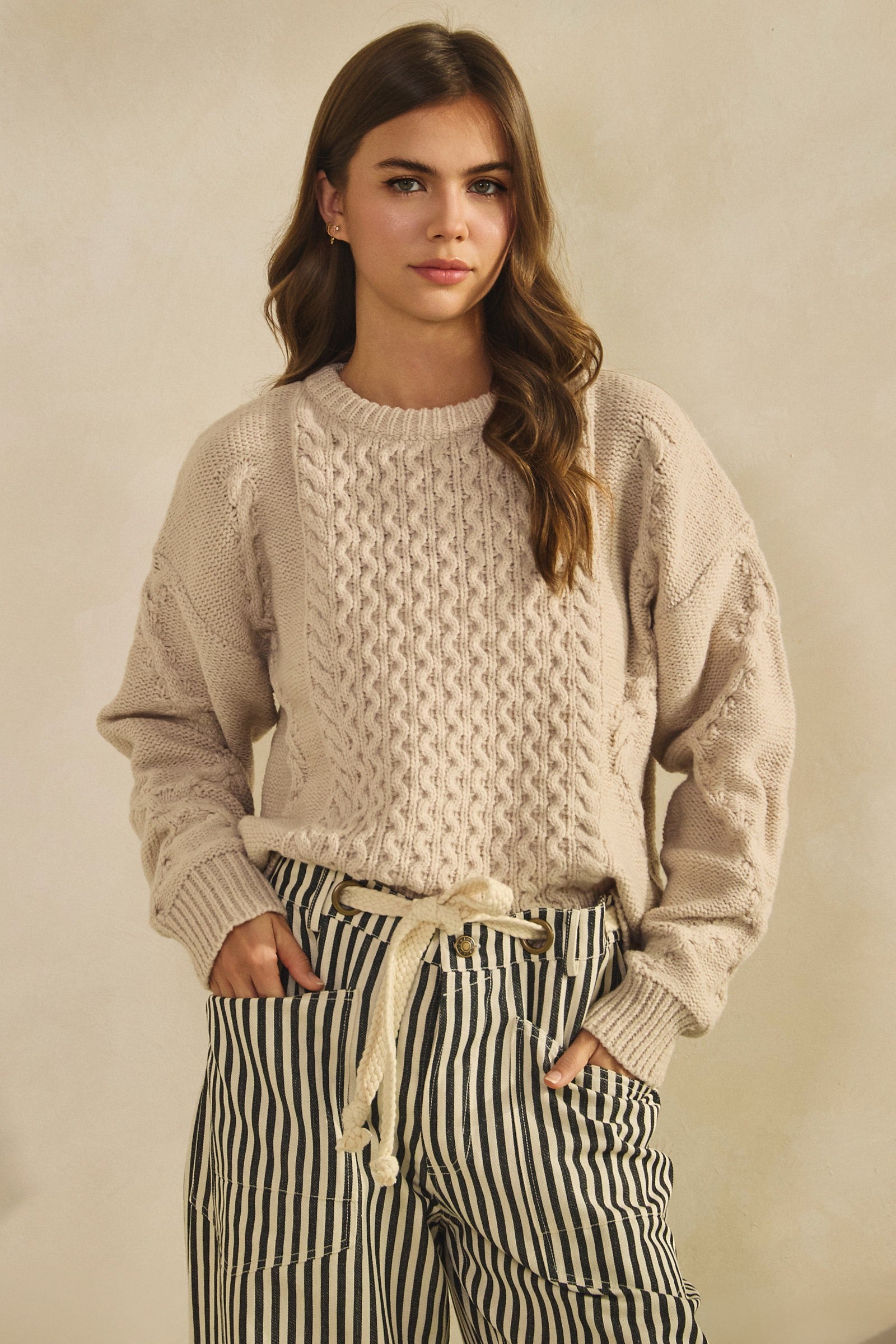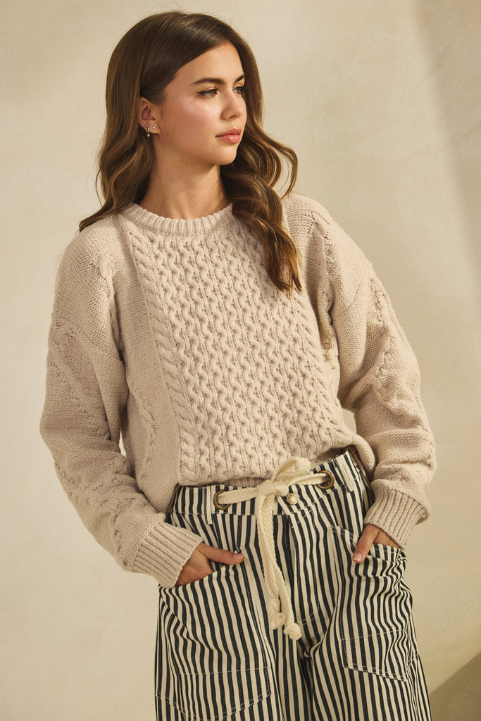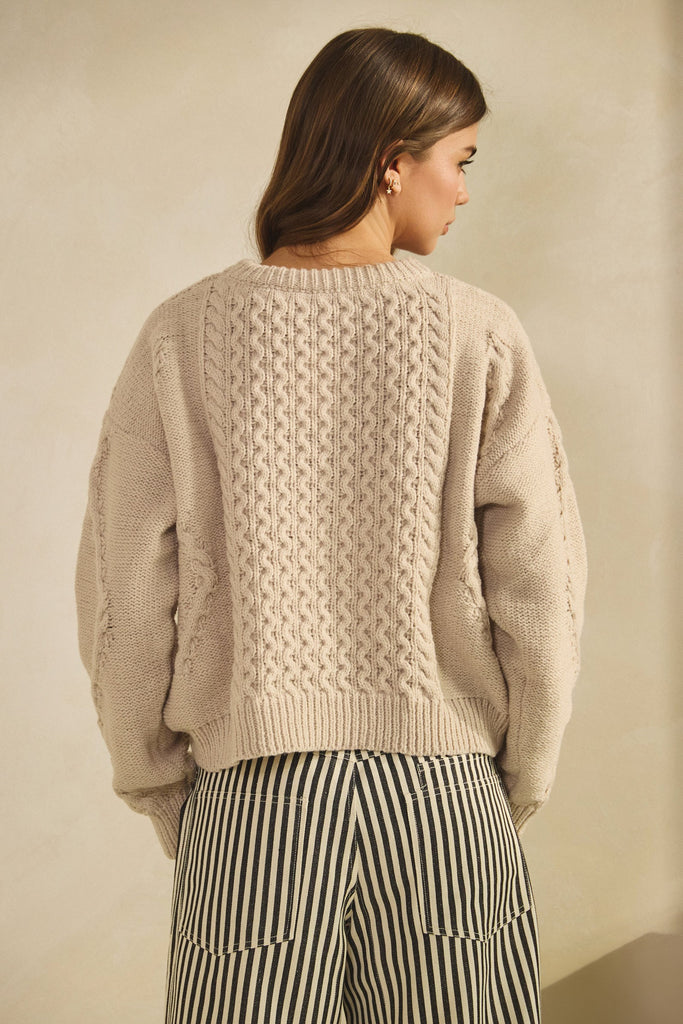 Wrap yourself in effortless style with this timeless knit sweater in warm oatmeal. Featuring a classic pattern that never goes out of fashion, it's the perfect layering piece for chilly days and cozy nights in. Soft to the touch and endlessly versatile, this sweater pairs beautifully with everything in your closet—from your favorite jeans to flowing skirts. Whether you're heading to brunch or settling in at home, you'll reach for this go-to favorite again and again. Model is wearing a size small.