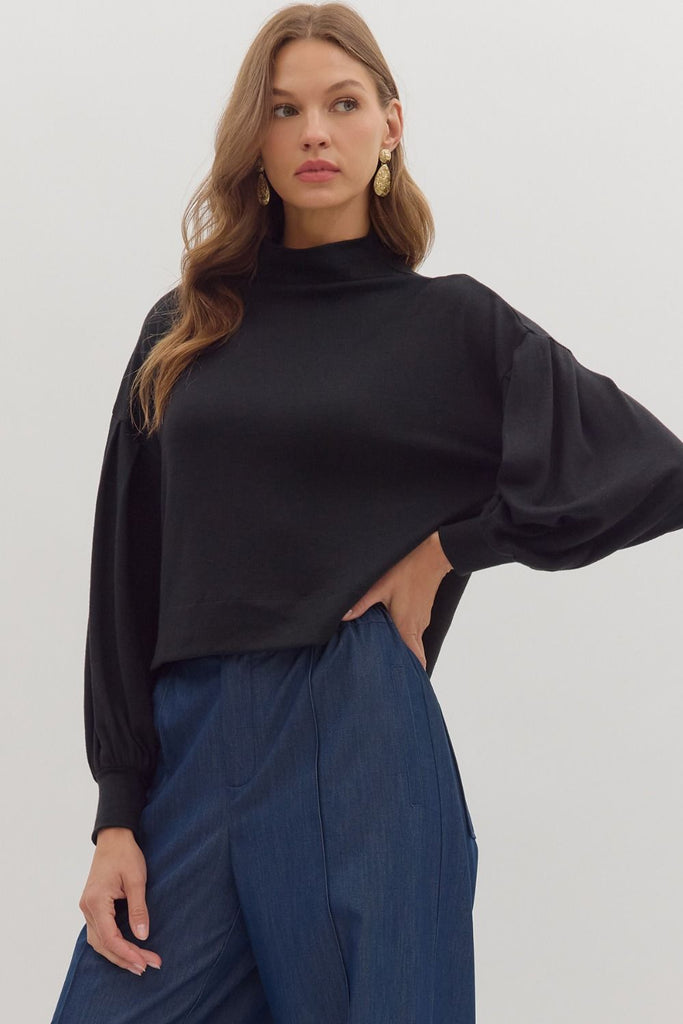 Solid Mock Neck Knit Top- Black