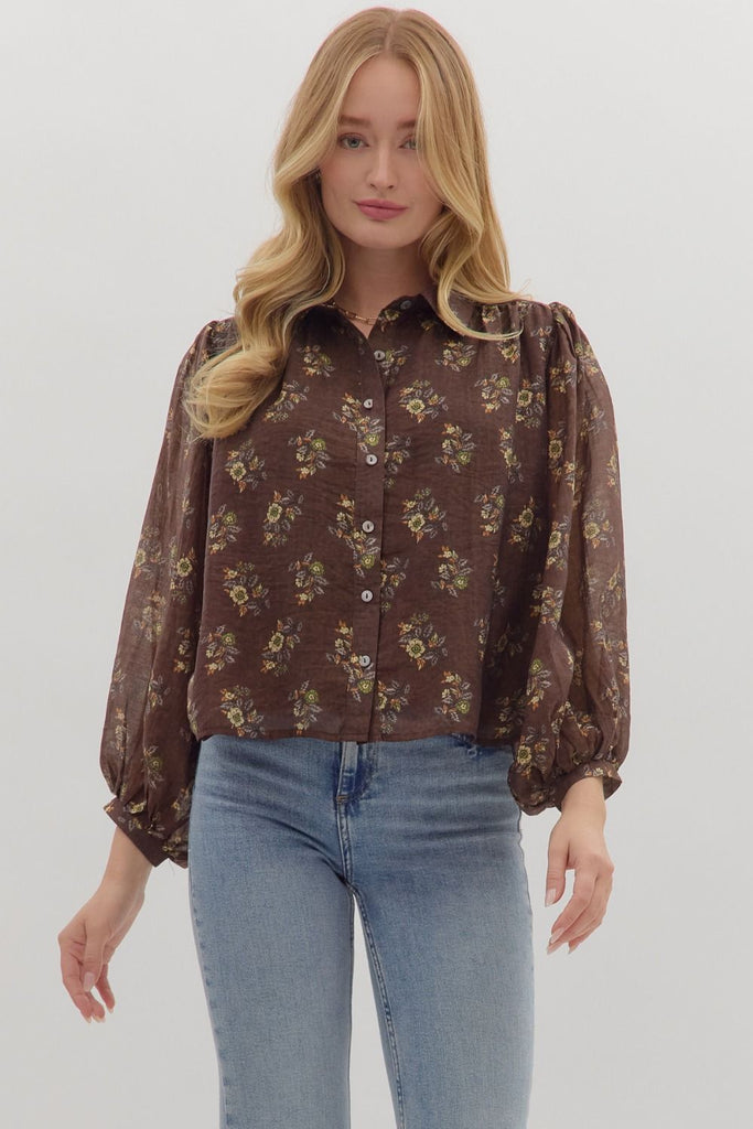 Botanical Print Button-Down Top- Brown