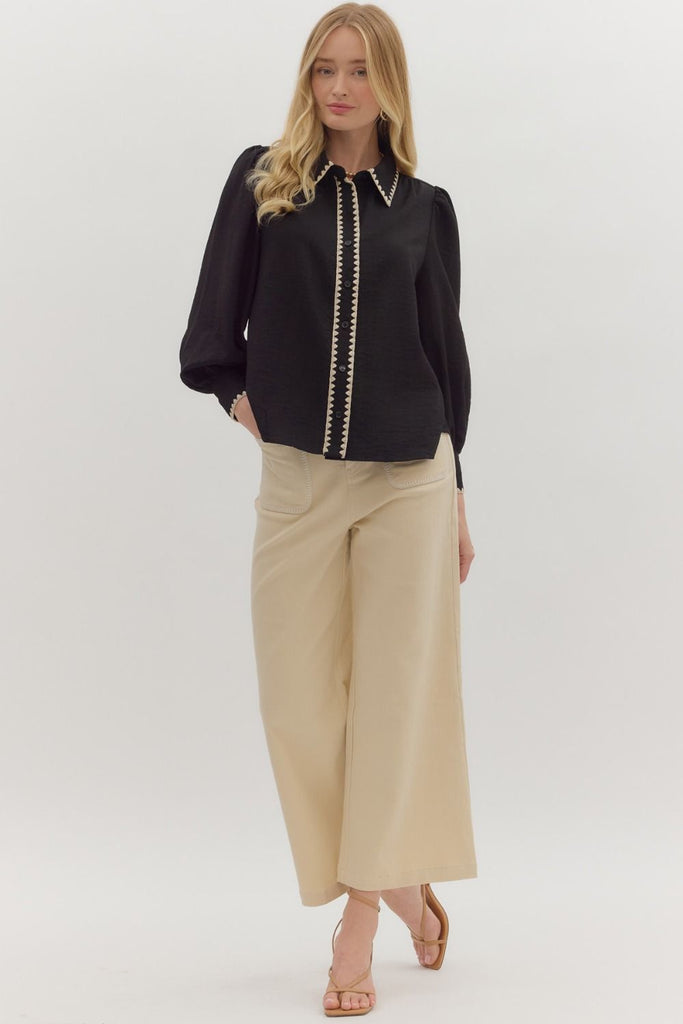Solid Blanket Stitch Accent Top- Black