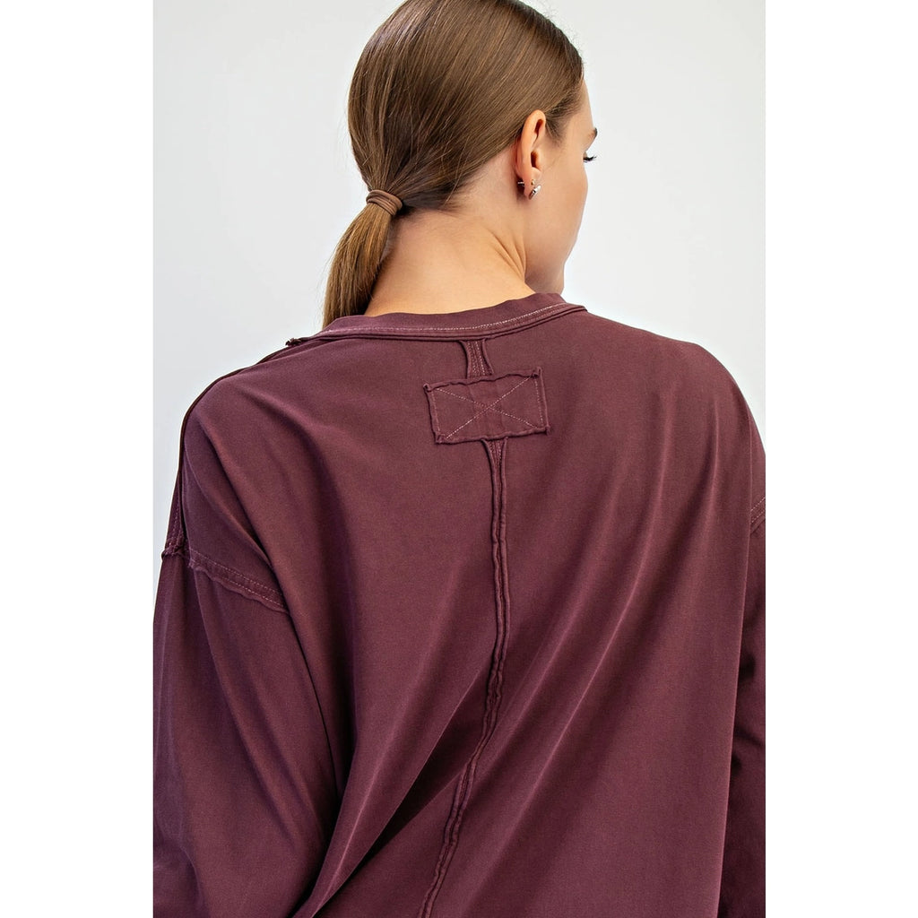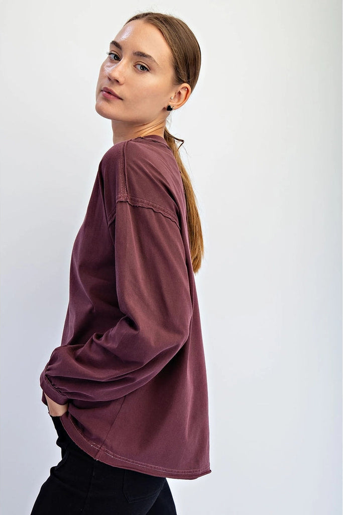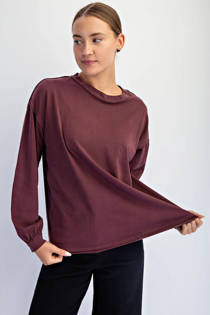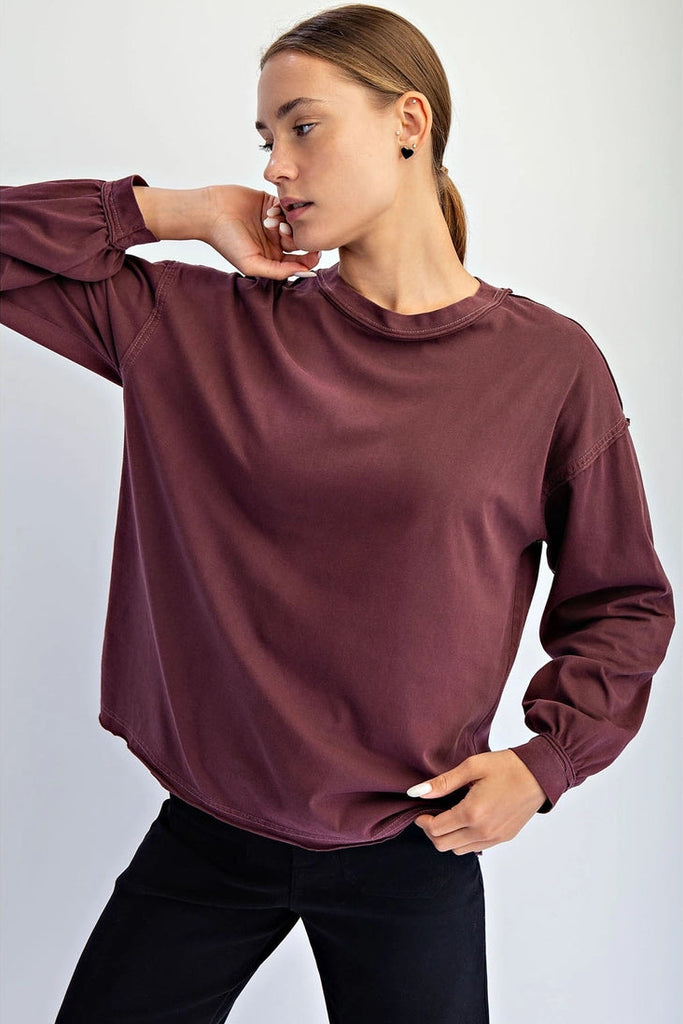 Easy and essential - with a twist. This pigment-washed cotton top blends everyday comfort with raw edge details and a relaxed cut, giving it just the right amount of character. It's the kind of basic that doesn't feel basic. Features: - Pigment washed cotton fabric - Lightweight and breathable - Relaxed fit - Long sleeve top - Dropped shoulders - Crew neck - Raw edge details Model is 5'9" and wearing size Small.