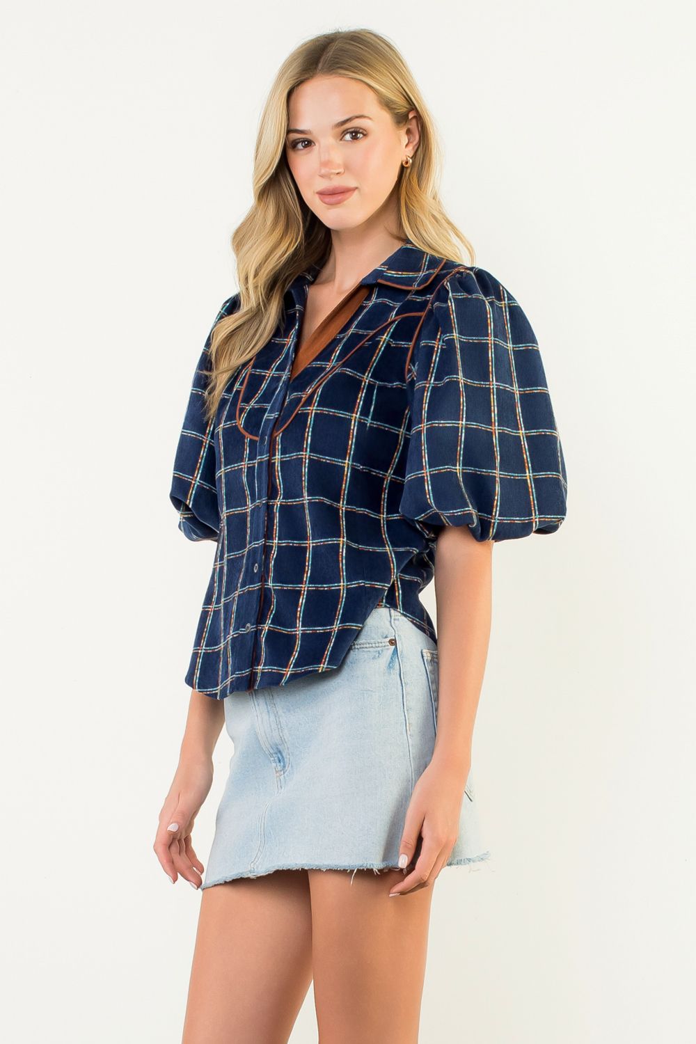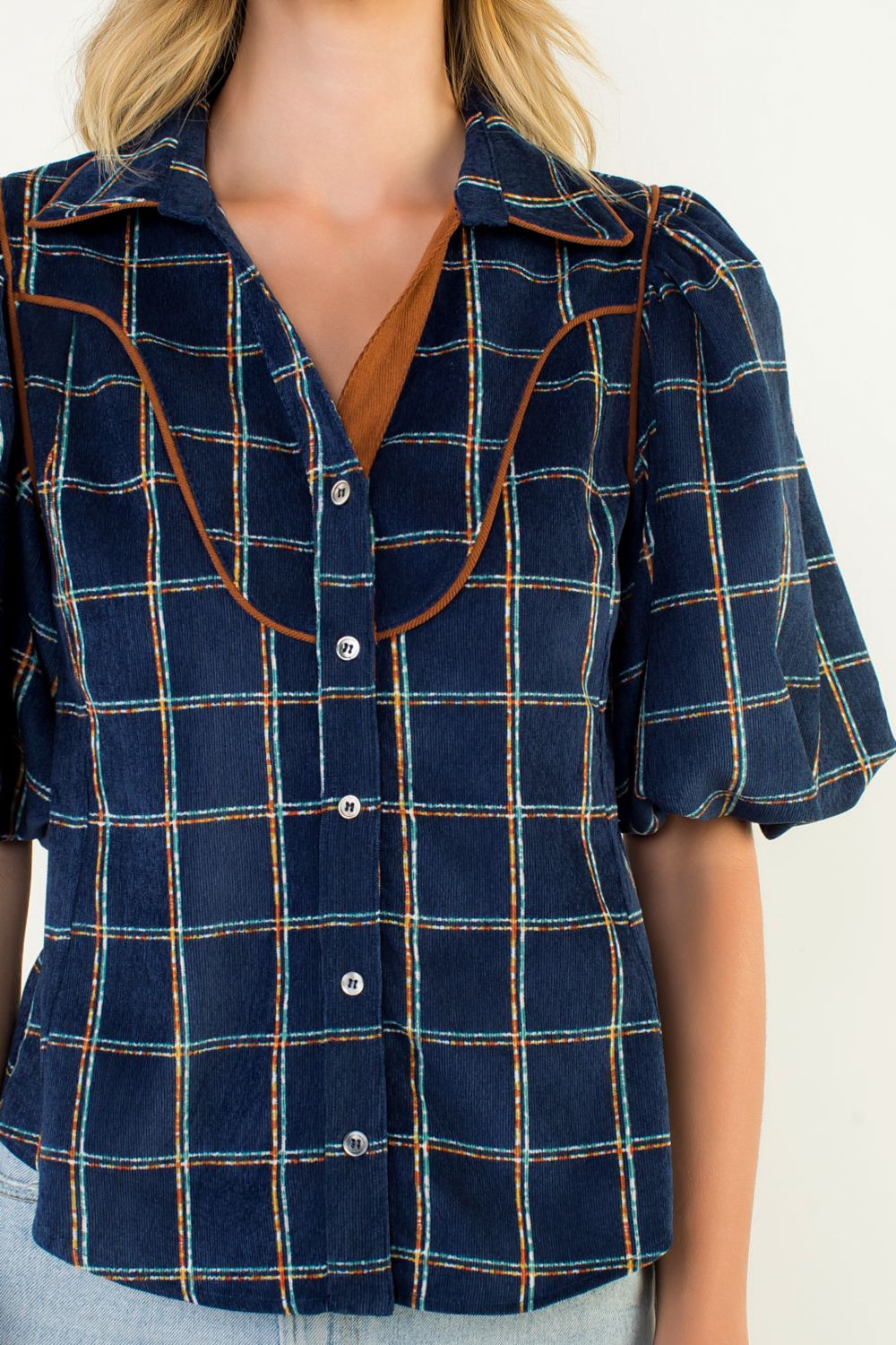 Saddle up in style with this charming puff sleeve corduroy top that brings Western flair to your everyday wardrobe. The classic navy and orange plaid pattern pairs perfectly with the cozy corduroy fabric, while the button-down front and playful puffed sleeves add just the right amount of personality. Whether you're heading to the ranch or the city, this versatile piece channels that effortless cowgirl aesthetic with a modern twist. Toss it over your favorite tee or wear it solo for an instant vibe upgrade.