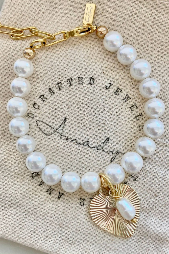 Add a touch of whimsy to your wrist with this Pearl Gold Heart Charmed Bracelet! Featuring creamy white natural mother-of-pearl beads and delicate gold-plated accent beads, it’s topped with a charming gold heart and a fresh freshwater pearl that sparkle with every move. Perfect for layering or wearing solo, this adjustable bracelet (6” + 2” extension) brings timeless elegance with a playful twist to any outfit.