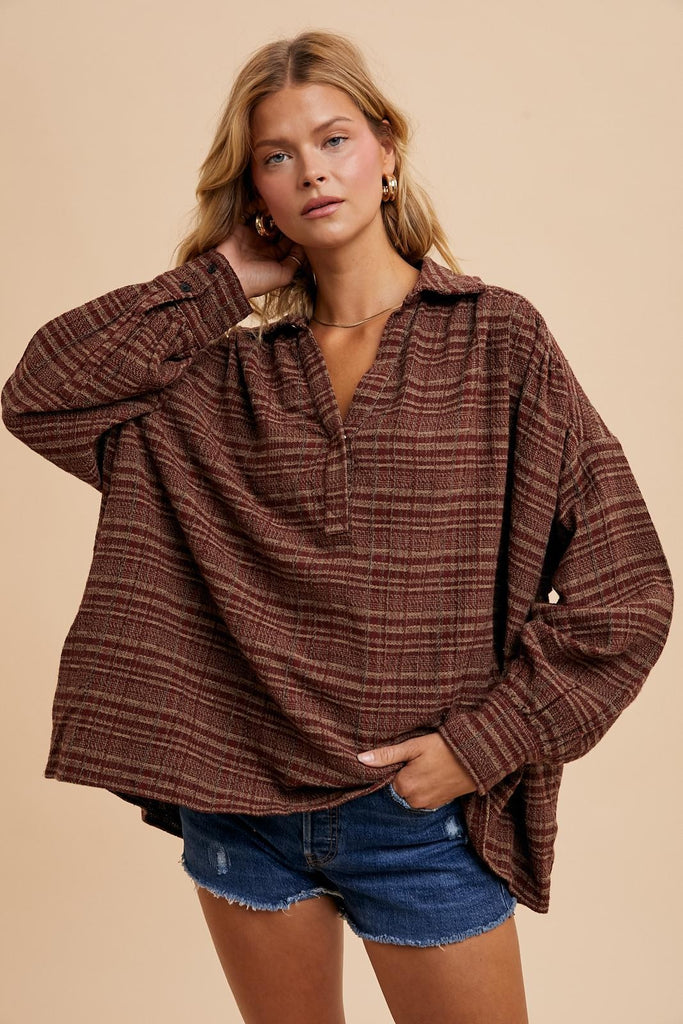Elevate your everyday style with this charming tweed plaid blouse that's equal parts cozy and chic. The split neck design features a hidden snap fastener for effortless styling, while cuffed balloon sleeves add a playful touch of personality. Cut in an oversized relaxed fit, it's the perfect piece for layering or wearing solo—think effortless sophistication with a wink and a smile.