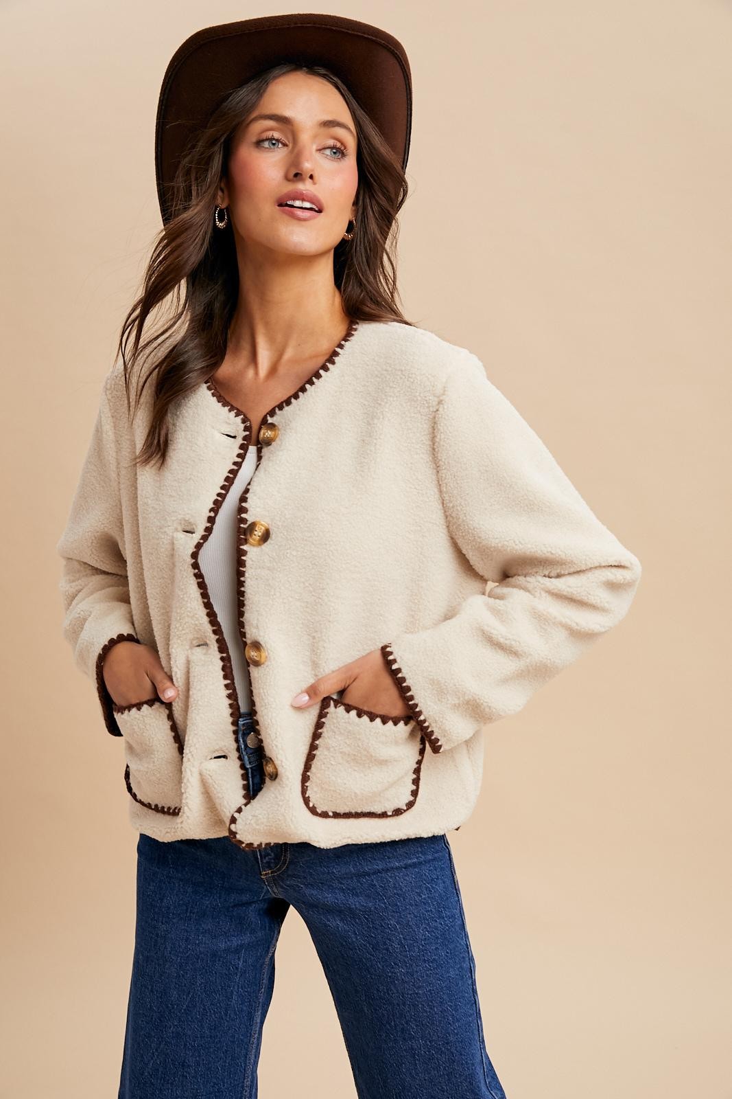 Wrap yourself in cozy charm with this darling sherpa cardigan! Featuring eye-catching contrast stitching that adds a playful pop of personality, this cream beauty boasts a classic round button closure for easy layering. Practical patch pockets keep your essentials close, while the full lining ensures comfort against your skin. Perfect for casual days or snuggling up in style—your new favorite piece is here!