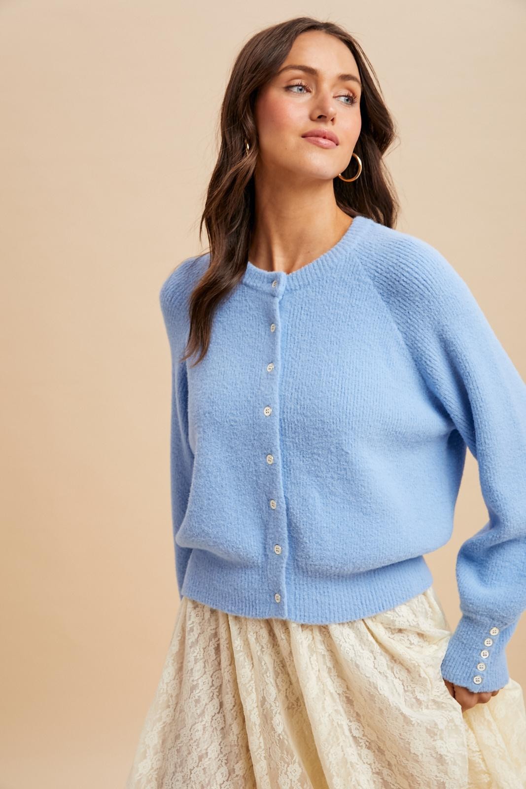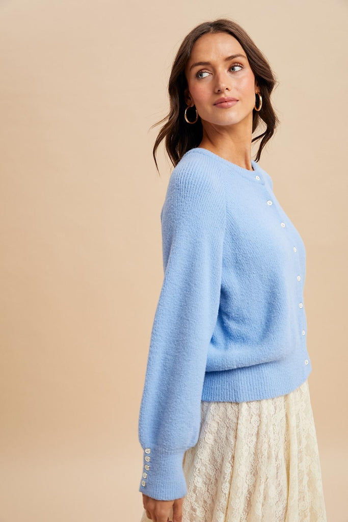 Wrap yourself in cloud-like comfort with this buttery soft ribbed cardigan in a cool icy blue shade. Featuring a classic round neckline, this cozy layer is elevated with gorgeous gold-edged enamel buttons and charming cuffed details that add a touch of sophistication. Perfect for layering over your favorite tees or dresses, this cardigan delivers both style and snuggle-worthy softness. Your new go-to piece for effortless, chic vibes.