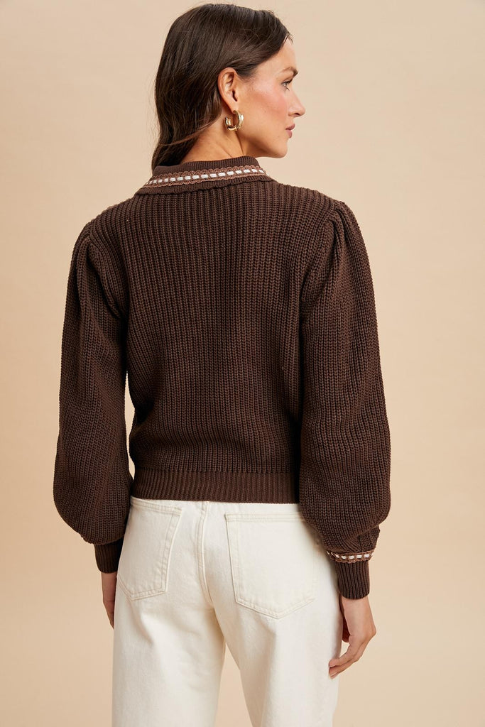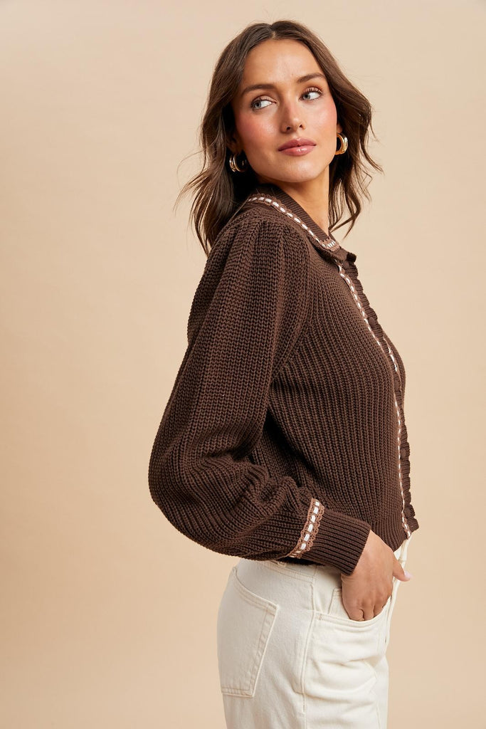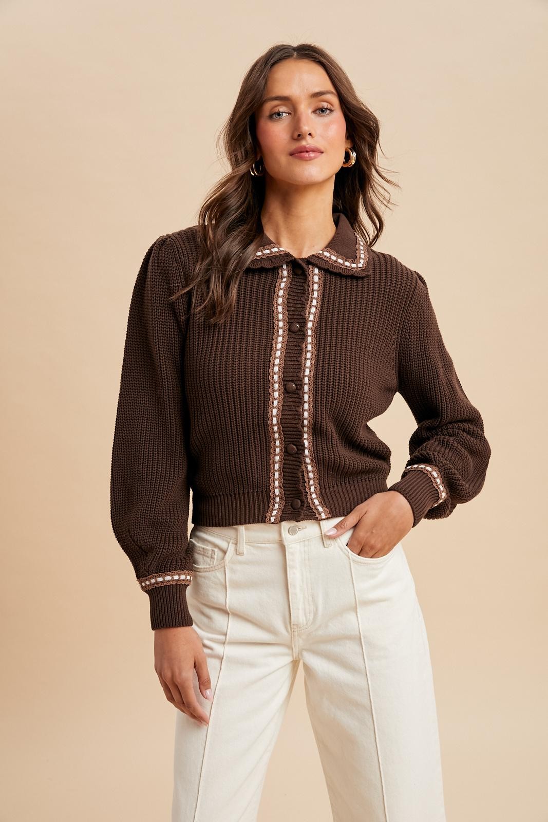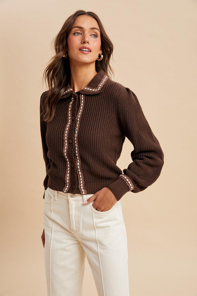 Introducing our adorable Doll Collar Knitted Cardigan in a warm hazelnut hue—the perfect piece for adding vintage-inspired charm to any outfit! This darling cardigan features a sweet scalloped doll collar, functional buttons for easy layering, and eye-catching contrasting slotted ribbon trim that adds a touch of elegance. Puff sleeves and ribbed banding complete the look with playful dimension and a flattering fit. Whether you're dressing up for a special occasion or elevating your everyday style, this knitted beauty is sure to turn heads and spark joy.