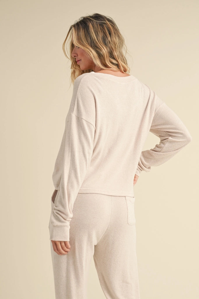 Cozy up in this playful beige top featuring a relaxed fit and a flattering V-neck. Crafted from soft brushed hacci fabric, it feels like a gentle hug all day long. Perfect for lounging or layering with your favorite jeans, this top brings effortless comfort with a touch of flair.