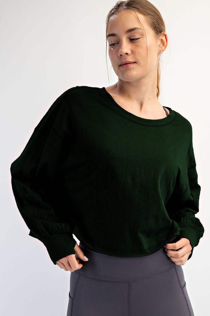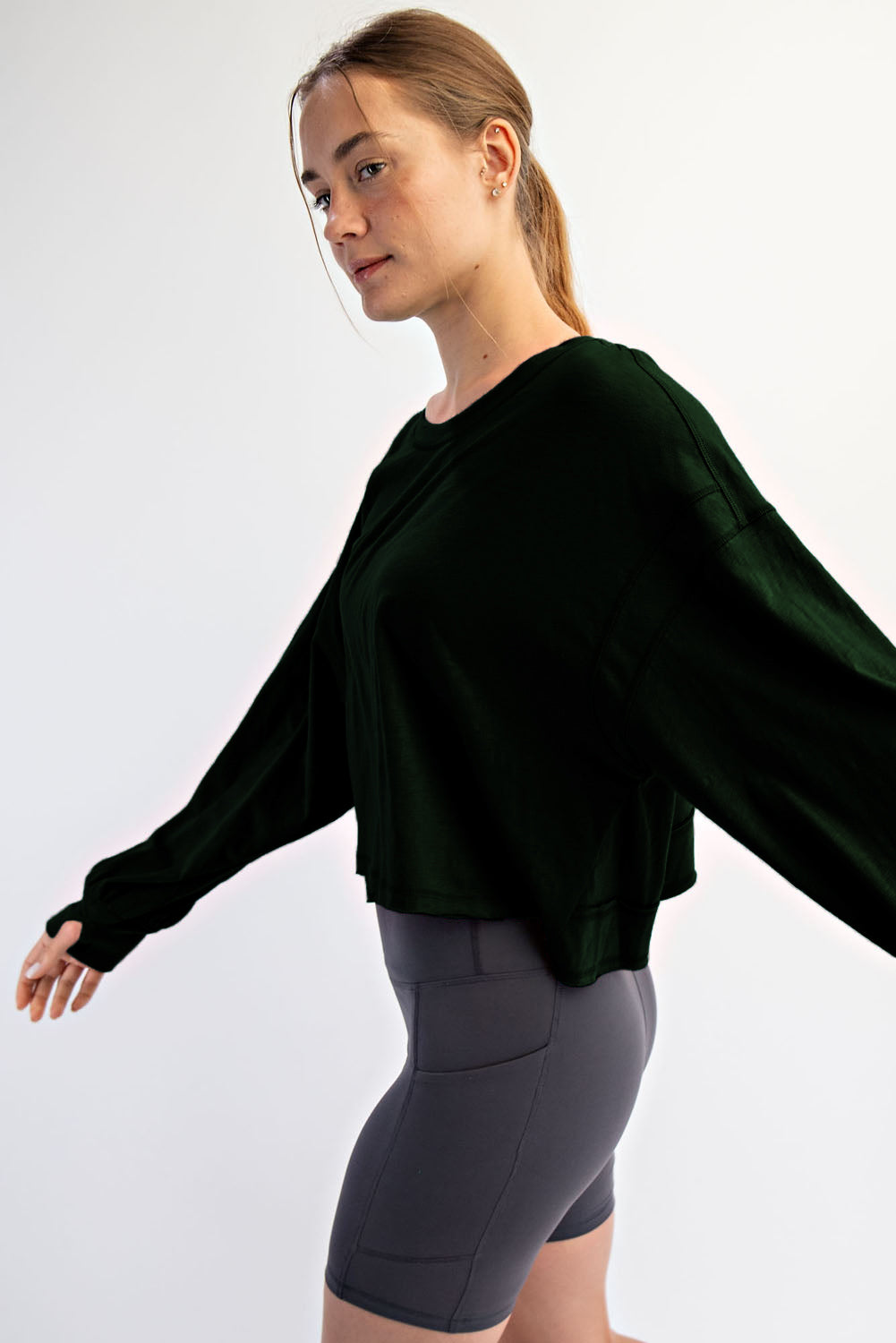 Crafted from breathable cotton slub, this relaxed long sleeve top features a cropped fit, wide neckline, and dropped shoulders. The open back adds a bold, stylish touch, while thumbhole details complete the effortlessly cool look.