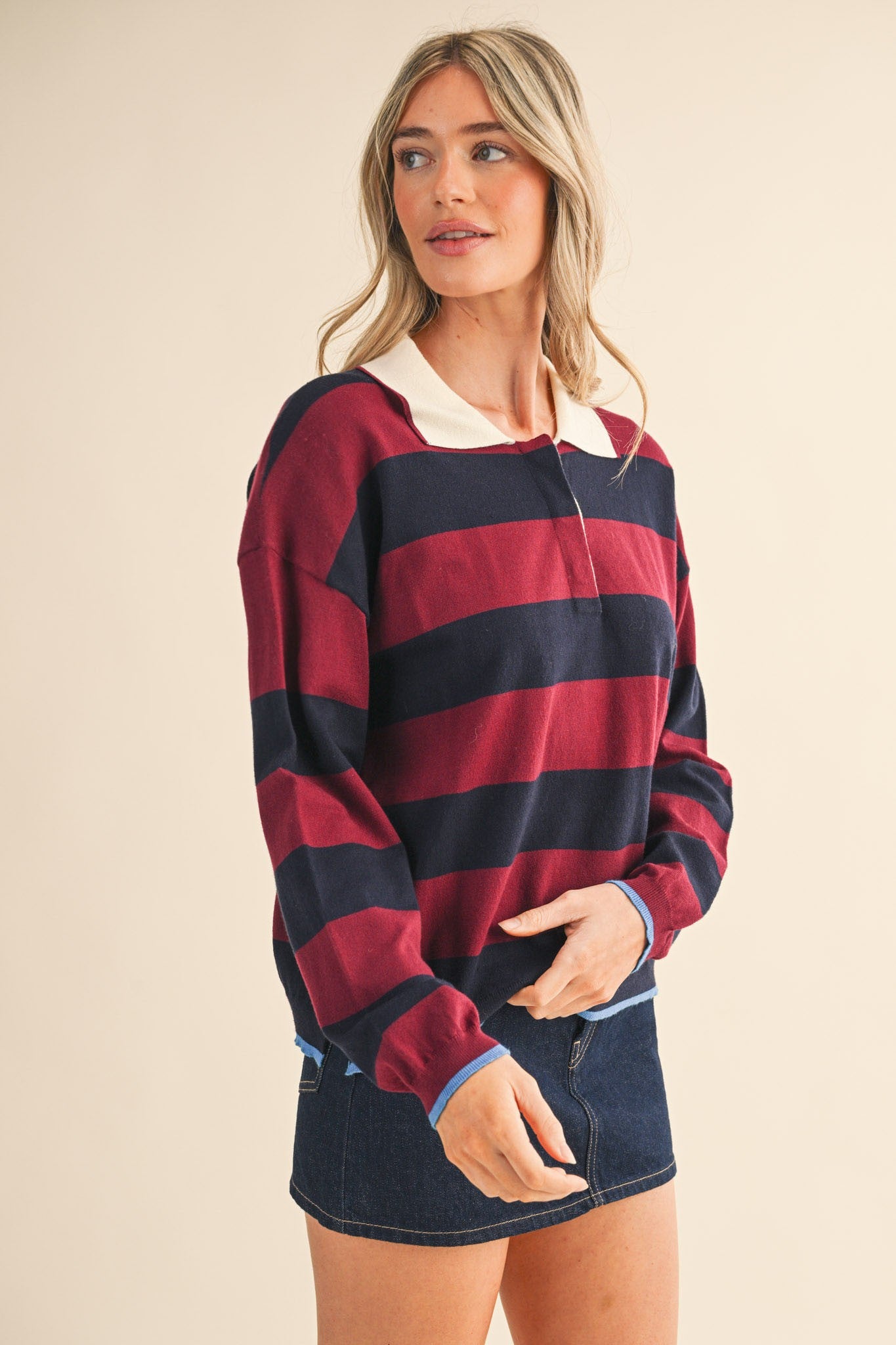 Striped rugby sweater + Collared neckline with button placket + Drop shoulder long sleeves + Slouchy relaxed fit pullover + Ribbed collar, cuffs, and hem + Model is 5' 7.5" 30-25-36 and wears a S