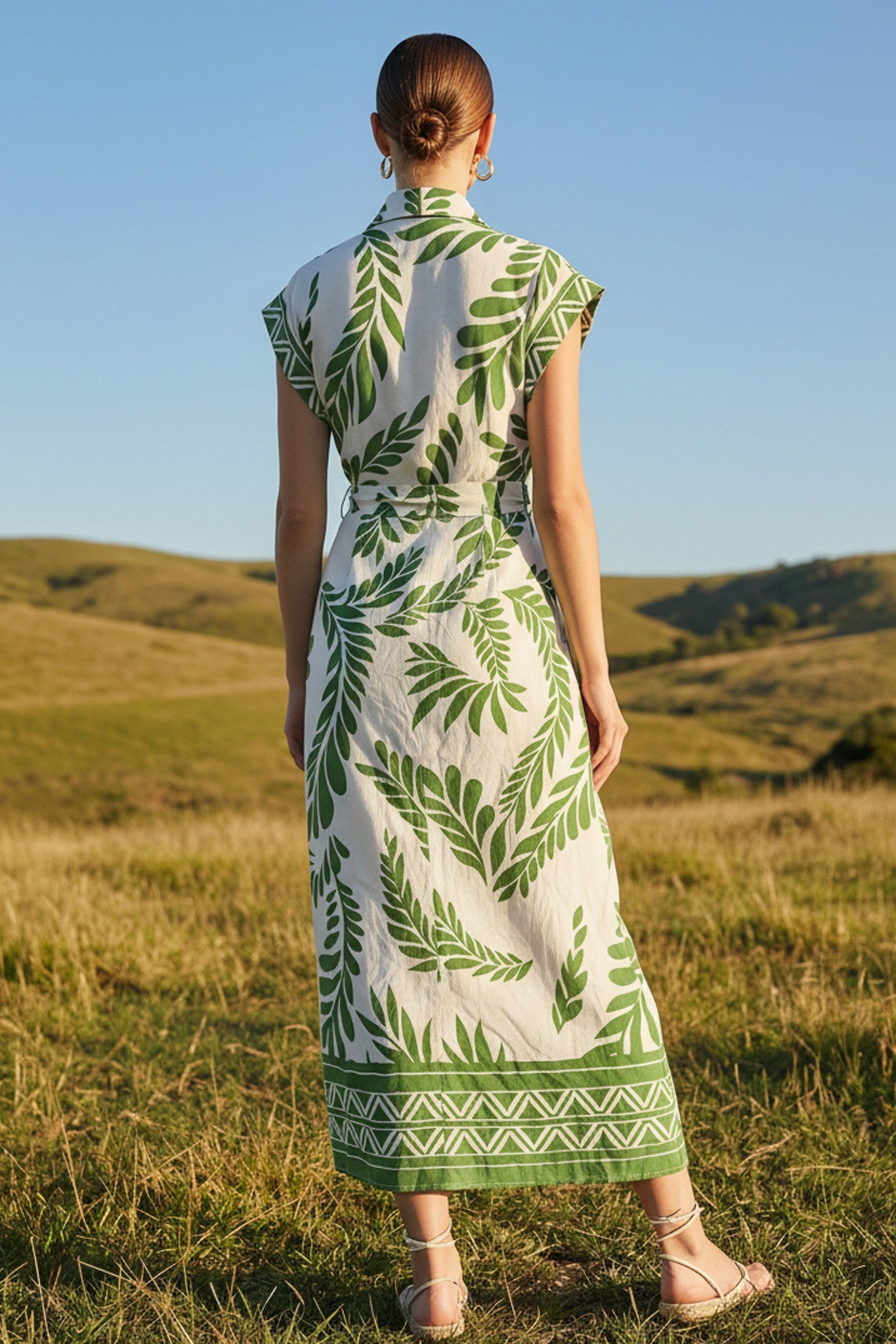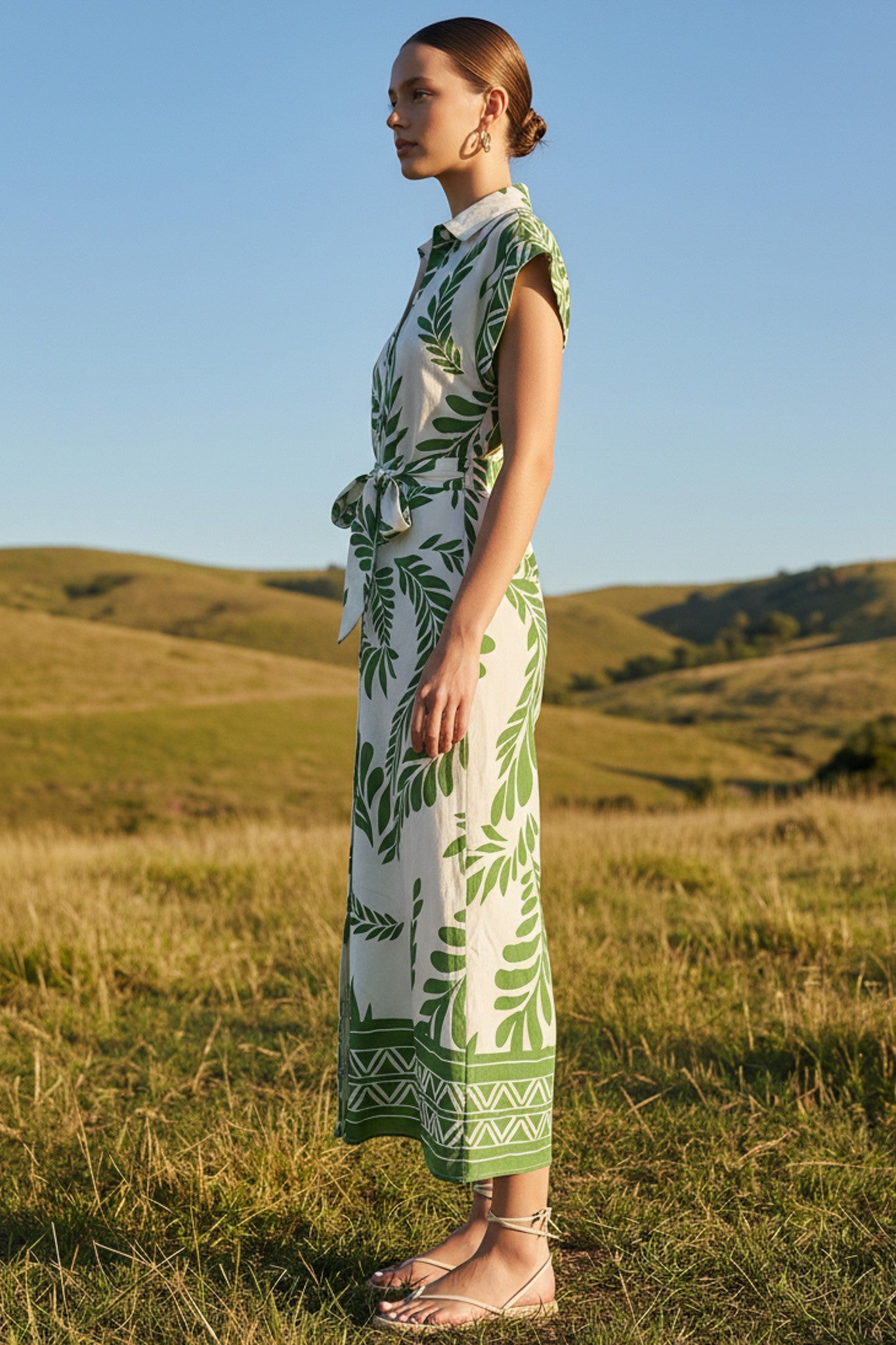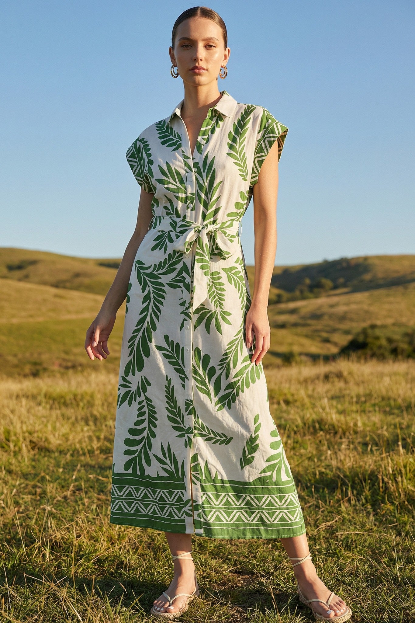 DESCRIPTION -Style: Printed roll-up sleeves side ruched front midi dress -Texture: soft -Color: Green Multi and Navy Multi -Pattern Type: leaf print -Details: roll up short sleeves,adjustable self belted, collared, midi dress, full button-front, leaf print,classic and casual,Incorporate modern hardware details with grommets,The collared neckline and front button closure offer a contemporary twist on a classic style. -Neckline: V-neck -Sleeve Length: short sleeve -Fit Type: relaxed fit SIZE &FIT The model is wearing size S Height: 5'9 Waist: 26'