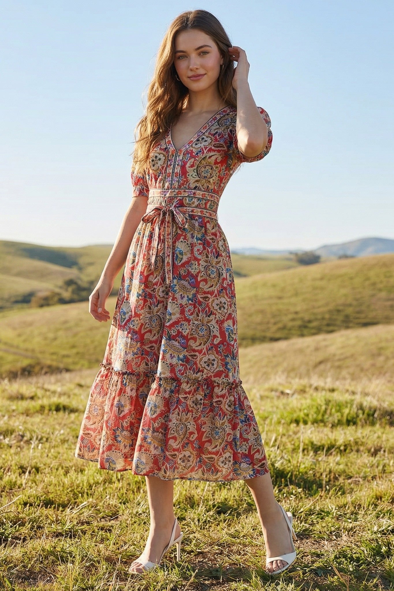 Puffed Short Sleeves Ruffle Hem Midi Dress-Multi