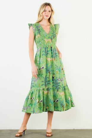 Flutter Sleeve Animal Print Tiered Maxi Dress-Green