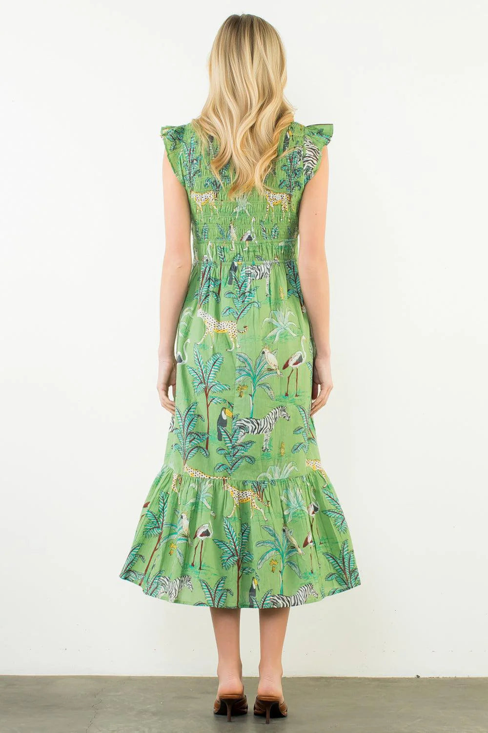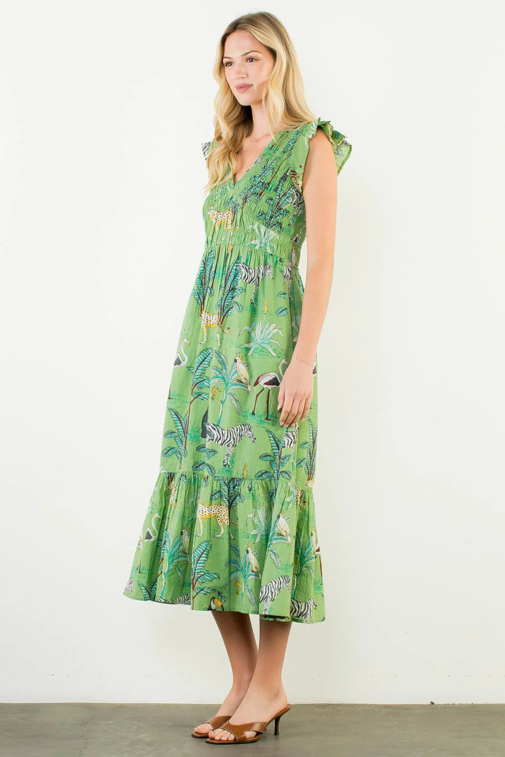 Get ready to turn heads in this Flutter Sleeve Animal Print Tiered Maxi Dress! This green goddess moment is all about those dreamy flutter sleeves and playful tiered layers that dance with every step. The wild animal print brings serious personality to your look, while the 100% cotton fabric keeps you cool and comfy all day long. Whether you're heading to brunch, a garden party, or just living your best life, this USA-designed maxi dress is your new go-to for effortless style. Swoon-worthy and oh-so-wearable!